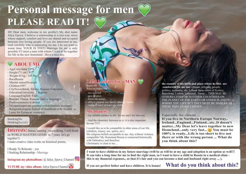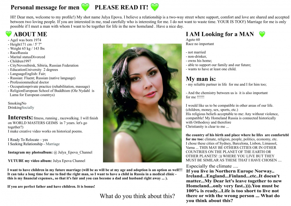 HI! Dear men, welcome to my profile!) My shot name Julya Epova. I believe a relationship is a two-way street where support, comfort and love are shared and accepted between two loving people. If you are interested in me, read carefully who is interesting for me. I do not want to waste time. YOUR IS TOO!) Marriage for me is only possible if I meet a man with whom I want to be together for life in the new homeland . Have a nice day. Looking for a partner Age to 60 Race no important - not married - non-drinker, owns his home; - able to support our family and our future; - wants to have at least one child. - My man is: -my reliable partner in life for me and I for him too; - And the chemistry between us is it is also important for me !!!!!! I would like us to be compatible in other areas of our life.(children, money, sex, sports, etc.) His religious beliefs acceptable to me: Any without violence, compatible! My Homeland Russia is connected historically with Orthodoxy and therefore Christianity is clear to me ... the country of his birth and place where he lifes are comfortebl for me too: climate, religion, people, politics, economy, etc. I chose these cities of Sydney, Barcelona, Lisbon, Limassol, Varna ... THIS MAY BE OTHERS CITIES OR IN OTHER COUNTRIES ON THE PLANET OF THE EARTH OR OTHER PLANETS !))) WHERE YOU LIVE BUT THEY MUST BE SIMILAR AS THESE THAT I HAVE CHOSEN .... Especially the climate If you live in Northern Europe Norway..Ireland...England...Finland...etc.. It doesn't matter... My Dear let's leave together to new Homeland...only very fast..))).You must be 100% is ready.......Life is too short to live not there or with the wrong person ... What do you think about this? I want to have children in my future marriage (will be as will be at my age and adoption is an option as well!!! It can take a long time for me to find the right man, so I want to have a child in Russia in a medical clinic - this is my financial expenses., so that it's fair and you can become a dad and husband right away ... ). f you are perfect father and have children. It is bonus!